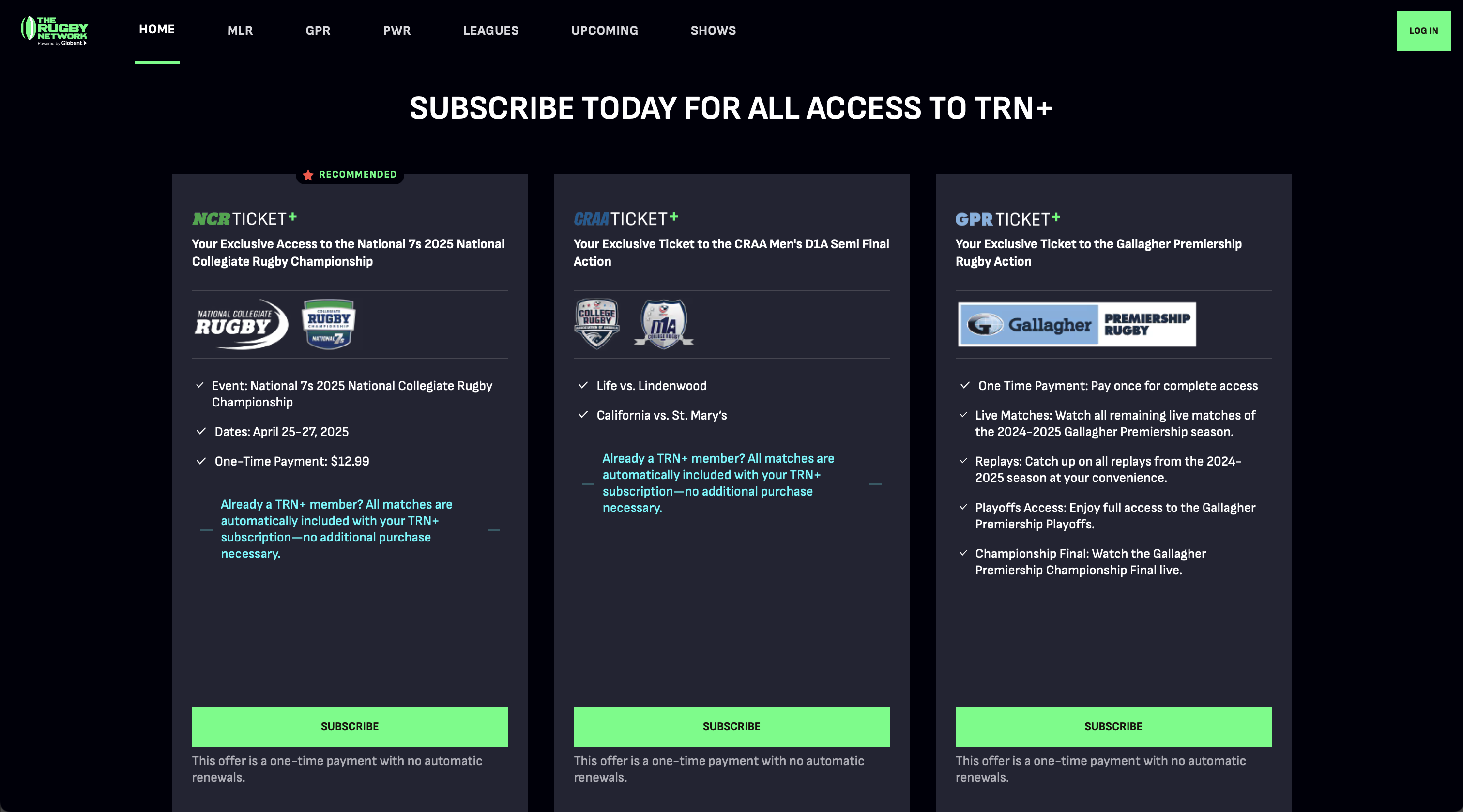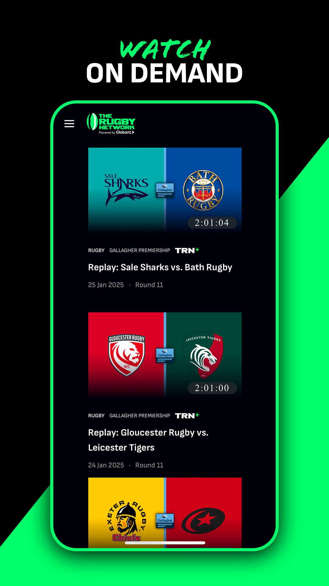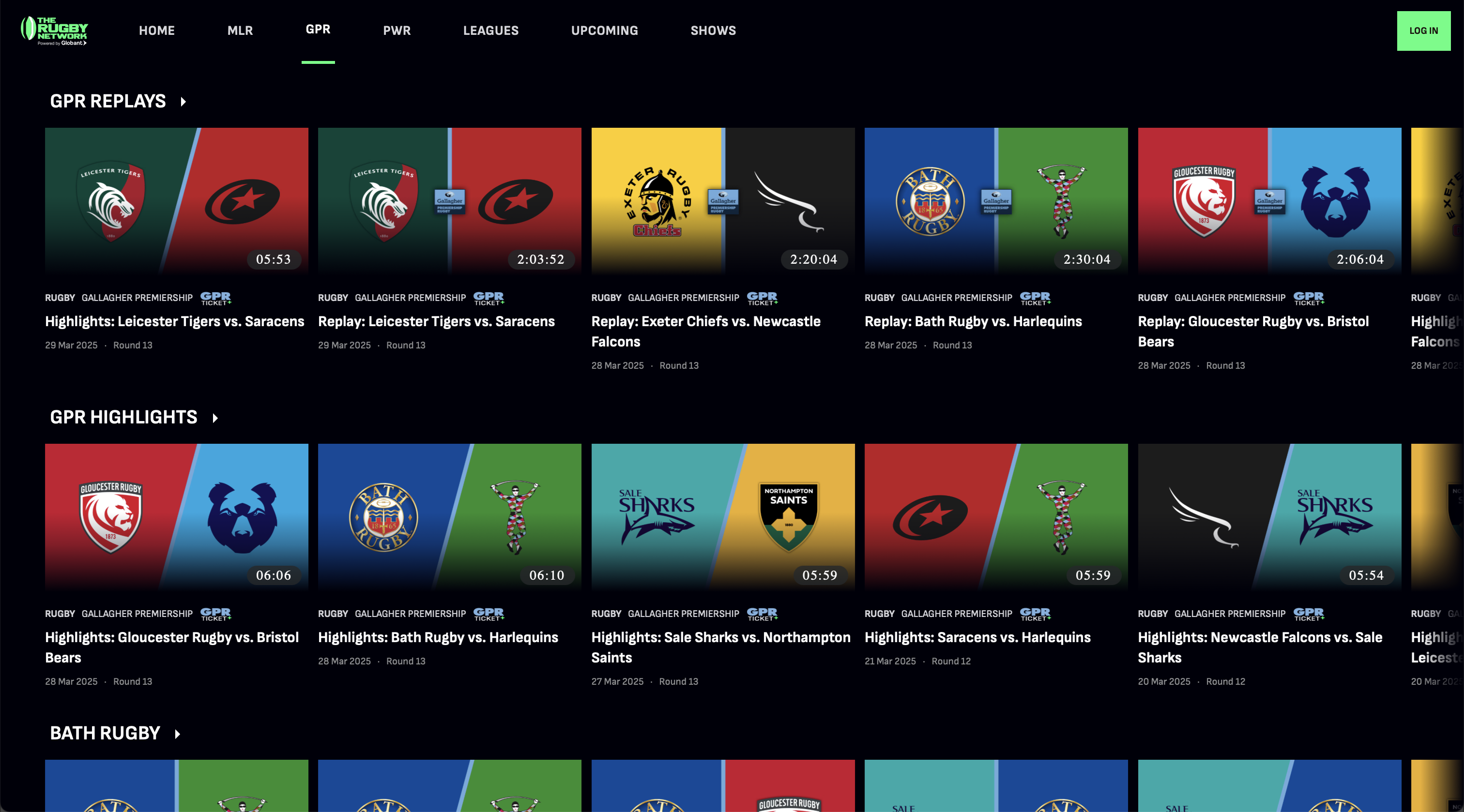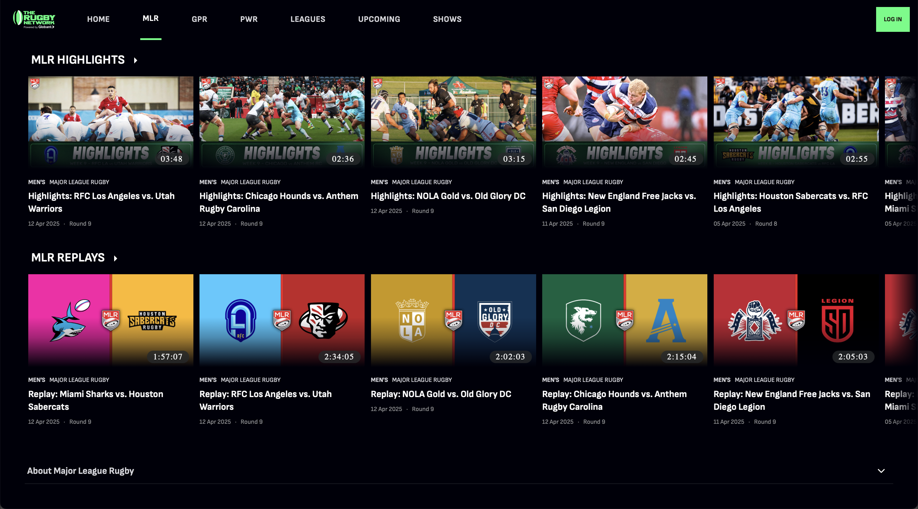 Watch professional rugby, including Major League Rugby, Gallagher Premiership Rugby, Premiership Women's Rugby, and the Premiership Cup. Enjoy college matches from NCR, CRAA, and Canadian Universities, as well as high school games and moreāall in one convenient platform.Please note: Content availability may vary by country or region.